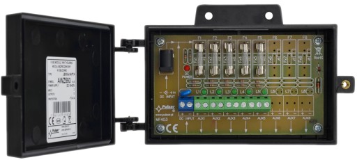 Moduł bezpiecznikowy Pulsar AWZ593 przeznaczony jest do rozdziału zasilania w systemach CCTV wymagających napięcia z zakresu 10V ÷ 30V DC. Posiada 2 wejścia zasilania: złącze śrubowe i gniazdo DC 5,5/2,1 oraz 5 niezależnie zabezpieczonych bezpiecznikami topikowymi 1A wyjść zasilania AUX1 ÷ AUX5. Zadziałanie bezpiecznika sygnalizowane jest przez zgaszenie odpowiedniej diody LED modułu: L1 dla AUX1, L2 dla AUX2 itd. Dodatkowo wejście modułu zabezpieczone jest warystorem chroniącym zasilacz przed skutkami wystąpienia przepięć w układzie zasilania.