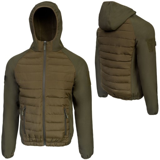 Korpus został uszyty jak klasyczna kurtka puchowa, a rękawy i kaptur z tkaniny technicznej Softshell.