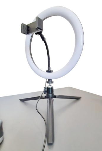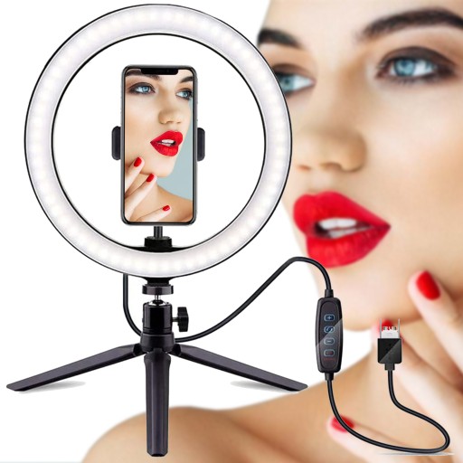 Lampa pierścieniowa 10” charakteryzuje się wewnętrzną średnicą 20 cm (26 cm zewnętrzna) oraz 120 diodami LED, równomiernie rozmieszczonymi w obudowie pierścienia oświetlającego. Lampa posiada regulację natężenia oświetlenia w zakresie 900-1700 lm oraz regulację temperatury barwowej (3 tryby) w zakresie od 2700 do 7000 K. Lampa posiada mocowanie uchwytu telefonicznego znajdującego się w zestawie, pozwalającego na umieszczenie smartfona w środku kręgu oświetlającego.