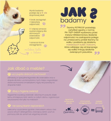 PETPROOF - oznacza zwiększoną odporność na zaciągnięcia i zadrapania spowodowane przez pazurki naszych domowych zwierzątek. Dodatkowo z tkaniny łatwo i szybko usuniesz sierść.