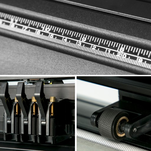 4 regulowane dwusprężynowe rolki dociskowe, aluminiowe radełkowanie, precyzyjne koła dociskowe i linia podziałki zapewniają zapobieganie odchyleniom podawania papieru na duże odległości.