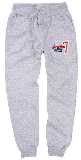 Krój: spodnie dresowe, w pasie na szerokiej gumie, z doszywanym ozdobnym troczkiem (nie ściąga spodni w pasie) , na dole w nogawkach ściągacz, na jednej nogawce aplikacja, po bokach dwie kieszenie.