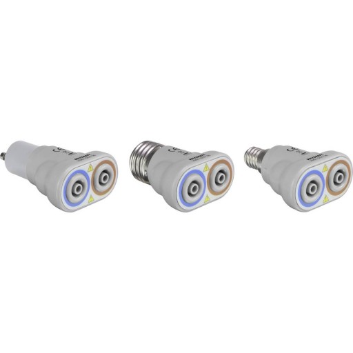 Zestaw adapterów pomiarowych zawiera 3 różne adaptery oprawek do pomiaru napięcia i izolacji. Adapter pomiarowy do trzonków E27, E14 i GU10. Do adapterów pomiarowych można podłączyć za pomocą 4 mm bezpiecznych przewodów pomiarowych multimetr, przyrządy pomiarowe izolacji i inne urządzenia bezpiecznie na czas trwania pomiaru. Dla wersji E14 i E27, gwintowany styk na gnieździe pomiarowym jest zaznaczony, co odróżnia N od L.
