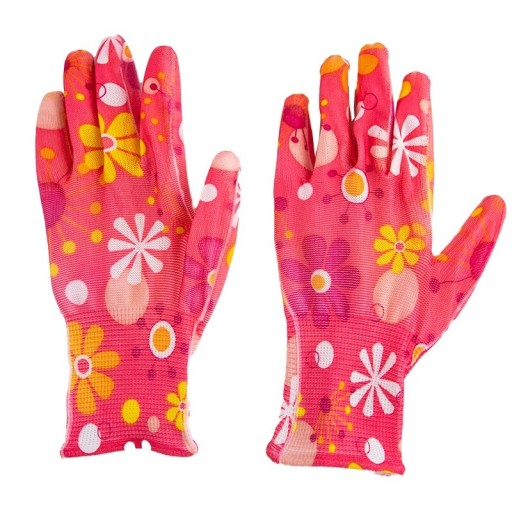 Rękawice robocze, ochronne, damskie, w kwiatowe wzory, poliestrowe, powlekane w części chwytnej poliuretanem - DALIA.