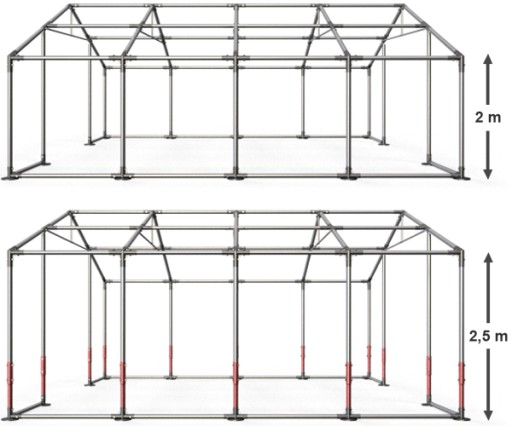 Konstrukcja modułowa pozwala w łatwy sposób zwiększyć lub zmniejszyć wysokość namiotu. Służy do tego dodatkowy zestaw podnoszący w postaci mocnych, stalowych rur o długości 0,5m lub 1m.