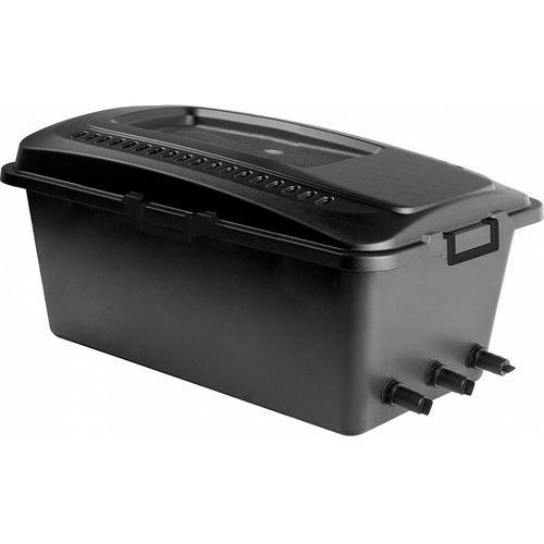 SuperMaxi to filtr przeznaczony do stosowania w oczkach wodnych lub stawach. Filtr rekomendowany jest do zbiorników o pojemności do 25 000l. Może być używany jako filtr zewnętrzny, umieszczony nad brzegiem oczka lub nad wpływem wodospadu bądź jako filtr zanurzeniowy, postawiony na dnie zbiornika wraz z zamocowaną na pokrywie pompą, gdzie pełni jednocześnie funkcję fontanny.Kompletny zestaw mediów filtracyjnych dołączony do filtra SuperMaxi gwarantuje kompletną filtrację mechaniczna i biologiczną. Filtr SuperMaxi wyposażony został w komplet mediów filtracyjnych: szczotki, gąbkę, kule Bio Max oraz matę kokosową. Posiada wszystkie niezbędne elementy do zamontowania na zewnątrz jak i wewnątrz zbiornika. Zestaw oprócz filtra zawiera rurkę pvc z kolankiem gumowym, 3 nakrętki, 3 śruby oraz podstawkę.