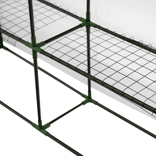 Szklarnia jest bardzo łatwa i szybka w montażu. Szerokie rolowane drzwi z zamkiem błyskawicznym stwarzają możliwość wentylacji bądź ochrony przed warunkami atmosferycznymi. W zestawie znajduje się 8 półek w dwóch rzędach na ścianie, których użycie optymalnie wykorzysta powierzchnię szklarni. Komplet zawiera wszystkie elementy do montażu: rurki i łączniki do stelażu, folię, 8 półek i instrukcję.