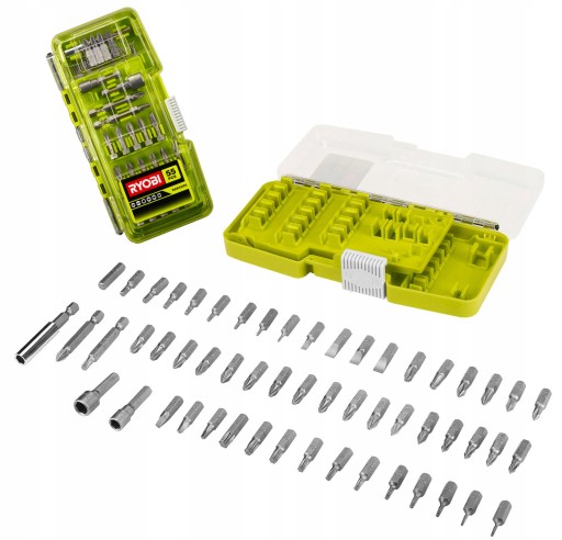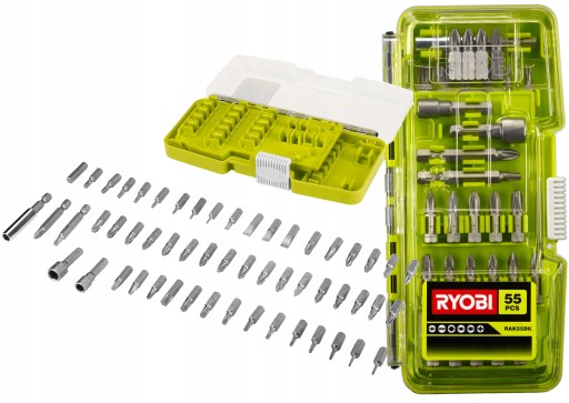 estaw do wkręcania 55szt. RAK55DK Ryobi umożliwia wykonywanie wielu rodzajów zadań, dzięki różnorodności elementów. Całość znajduje się w wytrzymałym, plastikowym pudełku, zapewniającym wygodę przenoszenia i przechowywania.