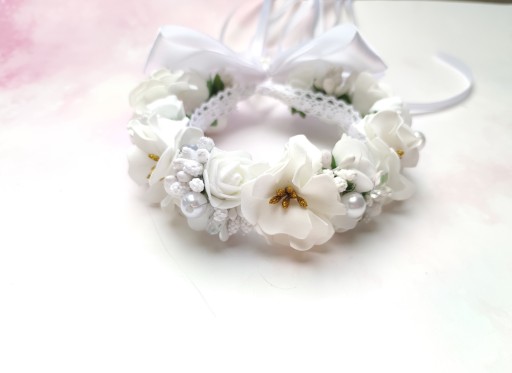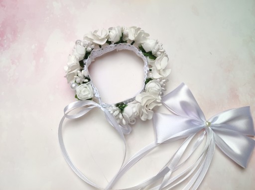 Wianek wykonany jest z różyczek piankowych , recznie robionych kwiatów i dodatków florystycznych. Kwiaty wyglądają bardzo realistycznie sprawiając, że dziewczynka będzie wyglądała delikatnie i elegancko w dniu Komunii Świętej.