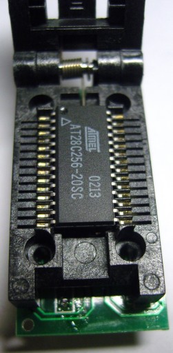 Adapter SO / SOIC 28 (SMD) na DIL 28 (PDIP) z wygodną podstawką typu Clamshell ZIF SO28 / SOIC28 - adapter dla mikrokontrolerów (m.in MCS-51 / AVR / ATmega / Atiny / PIC i in.), pamięci EPROM, EEPROM , Serial Flash i innych układów scalonych w obudowach SMD typu SO 28 o szerokości układu 300mils=7,64mm z rastrem 50mils=1,27mm i mniejszych (np. SOIC18, SOIC20 itp.) pozwalający na programowanie ich w podstawkach programatorów wyposażonych w złącze ZIF (MiniPRO, Stager, Wellon, Labtool 48, Xeltek Superpro itp).