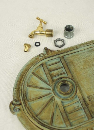 Żeliwny zlew ogrodowy montowany na posadzce i przykręcany do ściany za pomocą mosiężnego kranu.