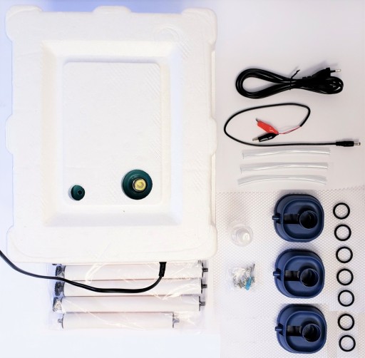 Dopływ wody do inkubatora odbywa się za pomocą zewnętrznego systemu składającego się z trzech oddzielnych podajników z kanałkami. Są to trzy podstawy, na których montowana jest zwykła półlitrowa plastikowa butelka wody (brak w zestawie).