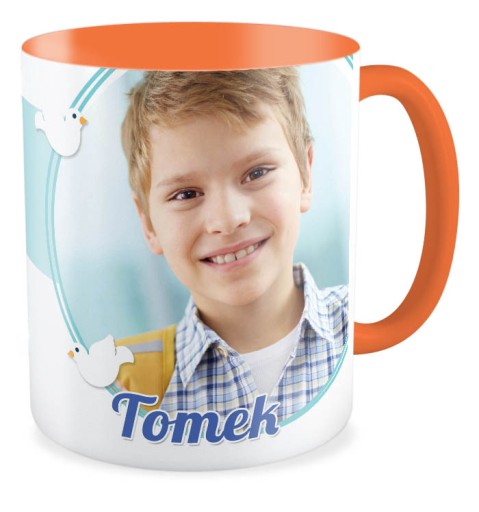 Pomarańczowe elementy kubka to jego uchwyt i środek. Pozostałe elementy, w tym miejsce w którym nakładana jest grafika, są w kolorze białym.