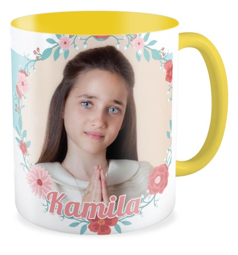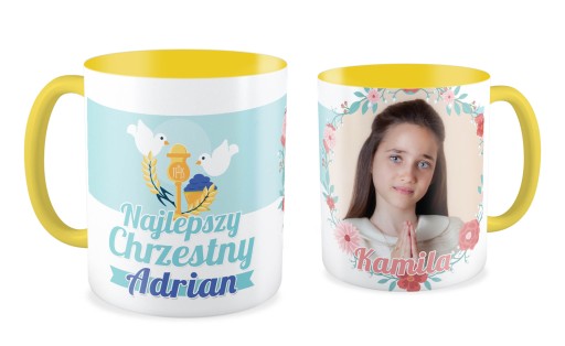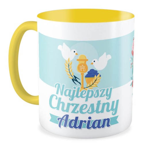 Żółte elementy kubka to jego uchwyt i środek. Pozostałe elementy, w tym miejsce w którym nakładana jest grafika, są w kolorze białym.