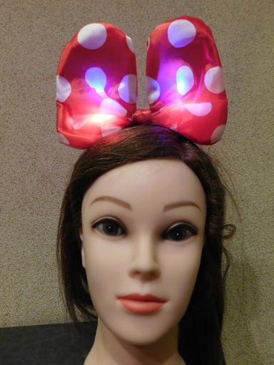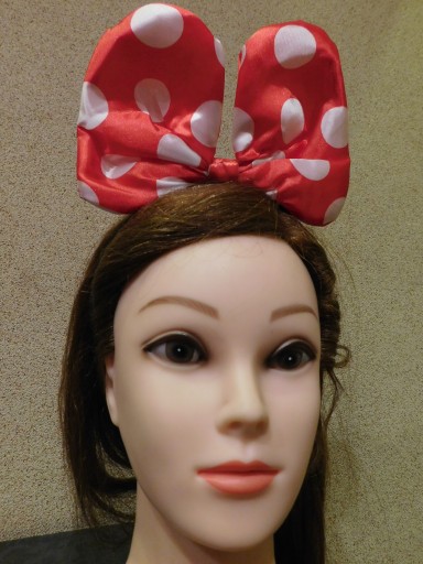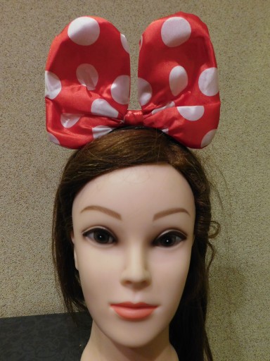 Fajna duża kokarda przymocowana jest do plastikowej opaski, która stabilnie utrzymuje ją na głowie .