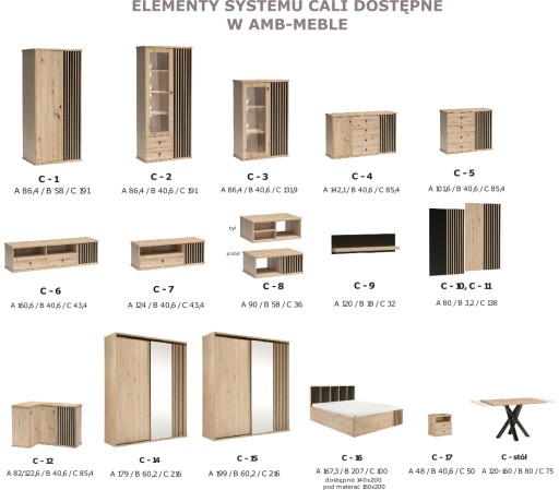 Zaletą systemu CALI jest fakt posiadania sporej liczby elementów, wchodzącej w jego skład. Sprawia on, że możemy świetnie zaprojektować wnętrze naszego salonu, sypialni a także biura lub gabinetu. Specjalnie dobrana tekstura oraz ciepłe naturalne wybarwienie koloru artisan w połączeniu z czarną, matową płytą i lamelami, podkreślają nowoczesny styl całej kolekcji. Wysoka dbałość o najmniejsze szczegóły i niepowtarzalne, oryginalne wykończenie, z pewnością zadowoli najbardziej wymagających Klientów.