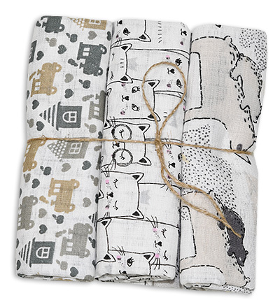 W zestawie znajdują się 3 różne pieluszki, zawiązane na śliczna kokardkę, stanowią idealny prezencik dla maluszka