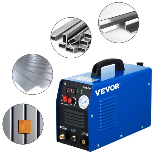 Wyjście i wydajność: AC 110/220 V; Znamionowy prąd wyjściowy: 50 amperów; Maksymalna grubość cięcia: 0,47"/12 mm; Cykl pracy: 60%; Przecinarka plazmowa inwerterowa nadaje się do cięcia stali nierdzewnej, stali stopowej, stali miękkiej, miedzi, aluminium itp.