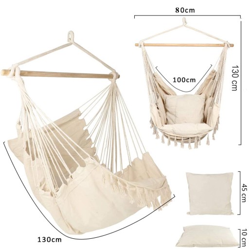 W skład zestawu wchodzi fotel, belka drewniana oraz 2 poduszki.