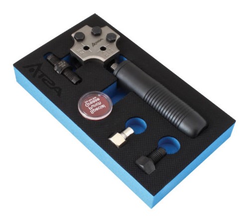 - W zestawie narzędzie do kielichowania, dwustronny stempel OP1/OP2, smar do matryc i śruba pozycjonująca.