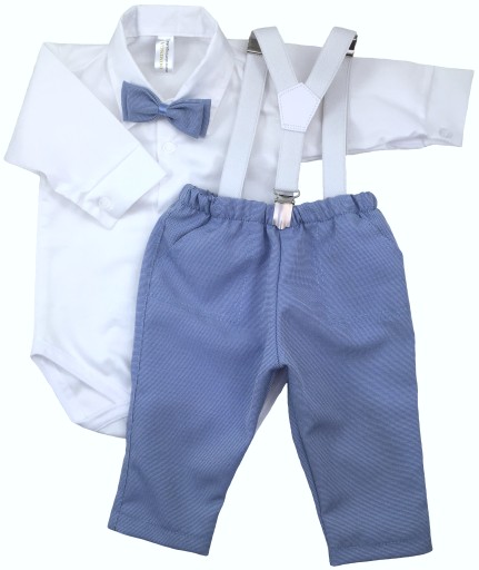 Wizytowe, białe koszulo-body + niebieska muszka na wstążeczce.
