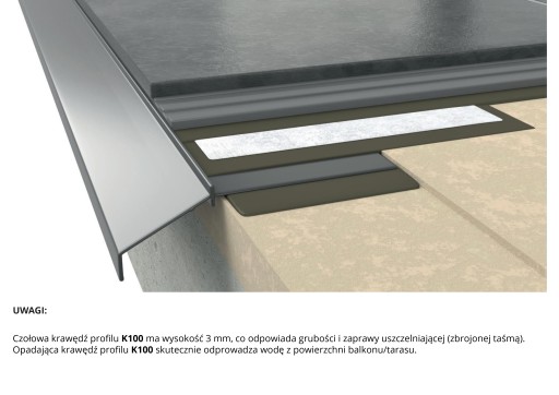 - wysoka sztywność profilu umożliwia jego właściwe osadzenie zapewniając skuteczne odwodnienie posadzki balkonu/tarasu bez możliwości tworzenia się zastoisk wody wzdłuż krawędzi posadzki.