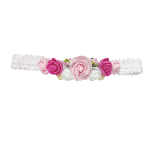 Opaska umieszczona jest na elastycznej gumko koronce o szerokości około 2cm w kolorze bieli. Koronka jest bardzo delikatna, elastyczna i elegancko wygląda. Kompozycja kwiatowa ma rozmiar okolo11cm x 3cm, wykonana jest z kwiatów o wielkości 3cm i 2cm.