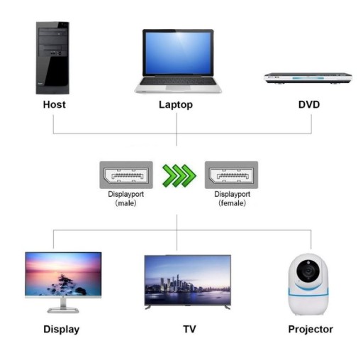 Kabel może być użyty do przedłużenia połączeń DisplayPort pomiędzy kartą graficzną a monitorem lub pomiędzy laptopem z portem DisplayPort a monitorem. Dzięki kątowemu wtykowi, kabel ułatwia połączenie przewodu do urządzenia w trudno dostępnych miejscach.