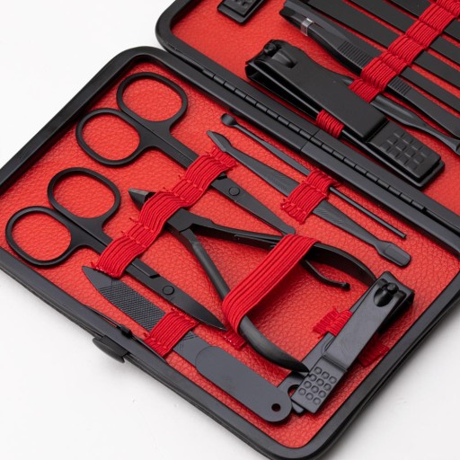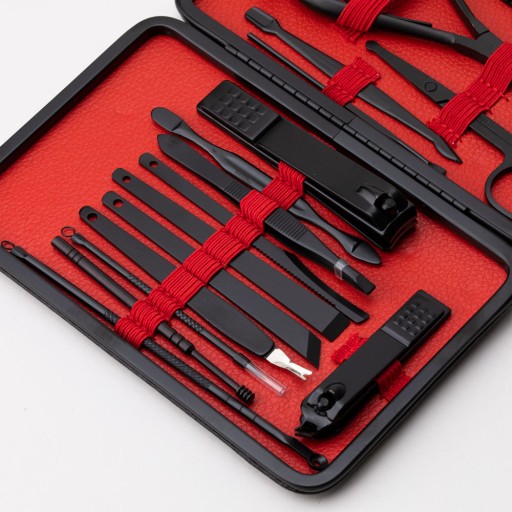 Zestaw 18 akcesoriów kosmetycznych do manicure, pedicure i zabiegów na twarz w czarno - czerwonym etui - CC046