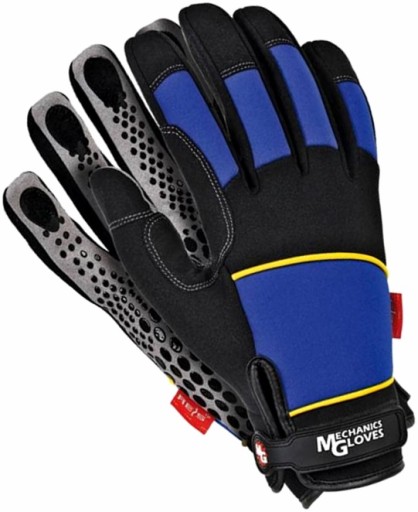 - dodatkowe wstawki z niebieskiego materiału na części wierzchniej rękawicy wraz z odblaskowymi paskami zwiększają widoczność