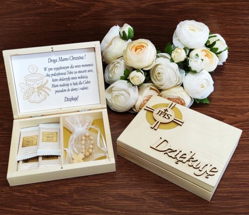 - Pudełko na wierzchu posiada wycięty ze sklejki napis Dziękuję oraz znak IHS