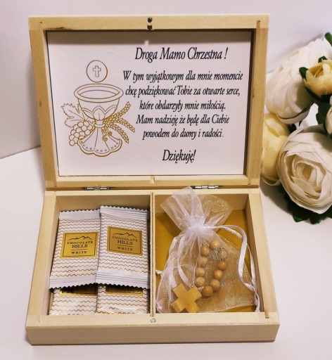 - Pudełko zawiera w jednej przegrodzie 4 szt czekoladek oraz w drugiej - różaniec w woreczku z organzy