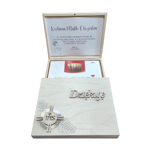 - Pudełko na wierzchu posiada wycięty ze sklejki napis: Dziękuję, znak IHS z ozdobnymi listkami