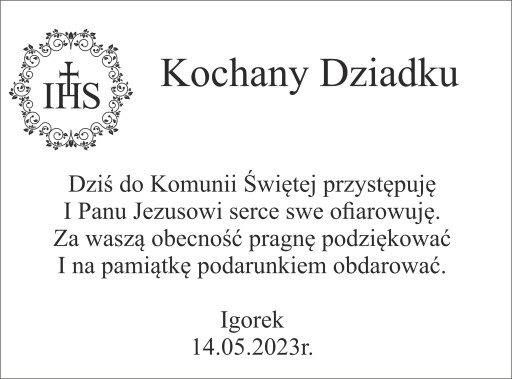 - Wyjątkowa forma podziękowania za obecność na I Komunii Świętej dla naszych gości, a w szczególności Rodziców Chrzestnych i Dziadków