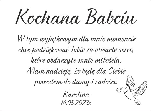 - W środku pamiątkowy tekst podziękowania drukowany na papierze ozdobnym (nie zapomnij podać dla kogo!!!)