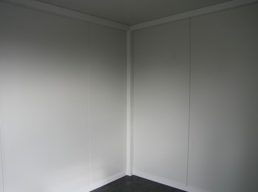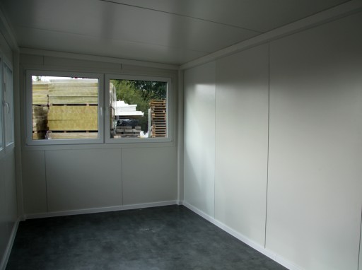 - Podłoga pawilonu wykonana z profili stalowych zamkniętych spawana oraz malowana, ocieplona warstwą pianki, wyłozona płytą OSB, wykończona wykładziną PCV.