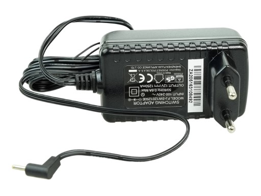Model: FJ-SW1201250E. Parametry wejściowe: 100-240 V AC. Parametry wyjściowe: 12V DC 1,25A, “+” w środku.