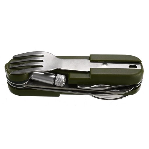 - Jedno kompaktowe narzędzie do 9 zastosowań pomoże ci na każdej wycieczce zjeść posiłek łyżką i widelcem, ale też rozłożyć namiot, otworzyć puszkę z przekąską, przeciąć linę, obronić się i wiele więcej.