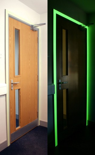 Taśma znakująca drogę do wyjścia jest najbardziej rozpowszechniona w Ameryce i Europie, gdzie obowiązują najsurowsze przepisy dotyczące jej użytkowania; w przypadku wysokich budynków, takich jak wieżowce, wymagane jest nałożenie taśmy fotoluminescencyjnej na wierzch listew przypodłogowych. Rozwiązanie takie pomaga ludziom opuścić pomieszczenia objęte pożarem. Dym, jako że jest gorący, unosi się i zasłania źródła światła. Oklejenie listew przypodłogowych i framug drzwi ułatwia dojrzenie wyjścia z pomieszczenia.