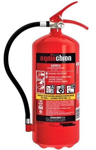 - Optymalna wielkość gaśnicy (9,3 kg), uniwersalność środka gaśniczego (6 kg proszku ABC) oraz prostota działania umożliwiają użycie urządzenia przez osoby dorosłe bez specjalnego przeszkolenia.