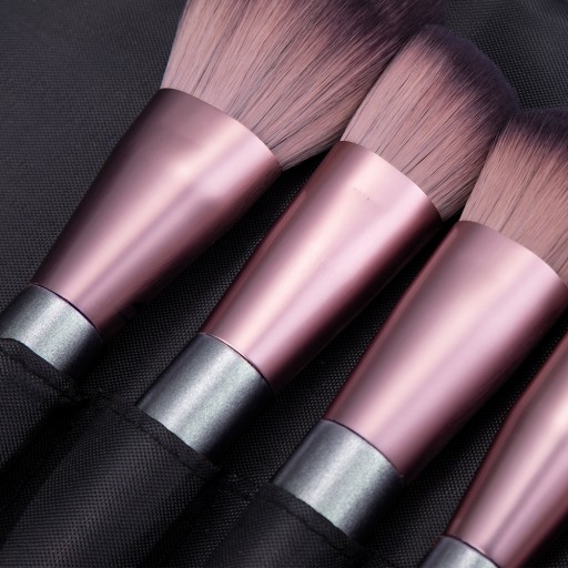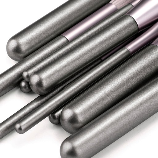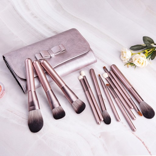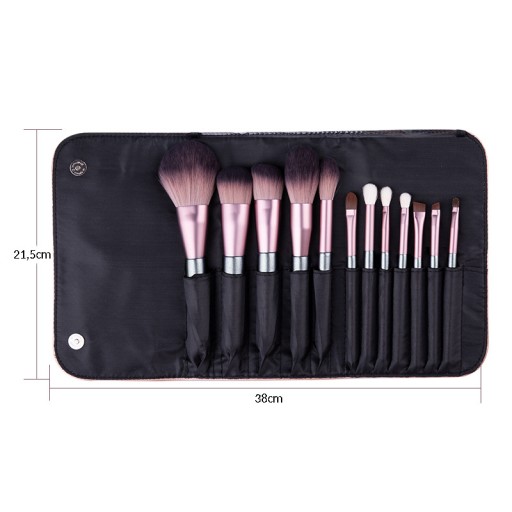 Ekskluzywny zestaw 12 profesjonalnych pędzli do makijażu wraz z elegancką kosmetyczką, w modnym kolorze metalicznego, brudnego różu.