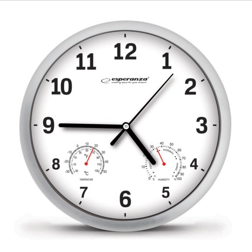 Nasz zegar ścienny Esperanza LYON służy nie tylko do pokazywania czasu - można na nim odczytać też temperature oraz wilgotność otoczenia. Jego wzornictwo sprawia, iż udekorujesz nim każde mieszkanie, biuro, sklep czy restaurację.