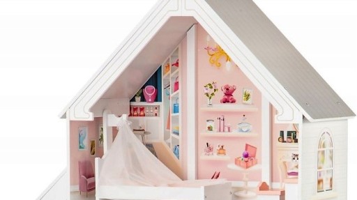Na pierwszy poziomie znajduję się łazienka oraz kuchniaz mebelkami i kuchenką. Dwa pierwsze poziomy połączone są za pomocą białych drewnianych schodów. Na pierwszym piętrze znajduje się przestronny salon z kanapą stoliczkiem i bujanym fotelem. Na tym samym poziomie znajduje się mały balkon z wiszącą huśtawką. Najwyższe piętro to wspaniała sypialnia z dużym łóżkiem oraz toaletką kosmetyczną.