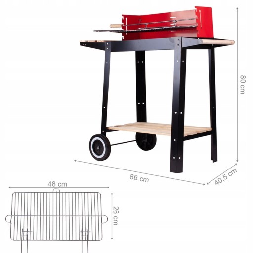 Grill wyposażony jest w dwie drewniane półki, które podnoszą komfort użytkowania. Jedna umieszczona jest obok misy paleniska, druga pod nią. Zastosowane rozwiązanie znacznie ogranicza potrzebę ciągłego odchodzenia od paleniska i przynoszenia niezbędnych rzeczy.