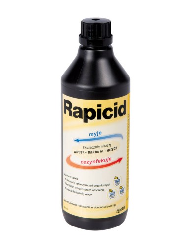 Rapicid to środek na bazie jodu w 5 litrowym baniaku przeznaczony do dezynfekcji obiektów inwentarskich. Ze względu na szeroki spektrum działania Rapicid może pełnić również rolę detergentu i służyć do mycia różnego rodzaju powierzchni. Zawartość czynnych związków zawartych w dezynfektancie pozwala łatwo wniknać w powierzchnie porowate i trudno dostępne. Preparat charakteryzuje się niską toksycznością - można stosować go w obecności zwierząt. Środek nie podrażnia dróg oddechowych oraz nie wywołuje alergii u ludzi i zwierząt