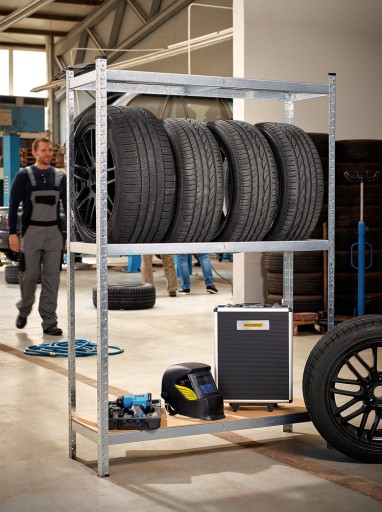 Stojak na opony Deuba jest wykonany z całkowicie ocynkowanej stali i jest wyposażony w półkę z płyty MDF, na której można przechowywać narzędzia, kołpaki lub felgi.