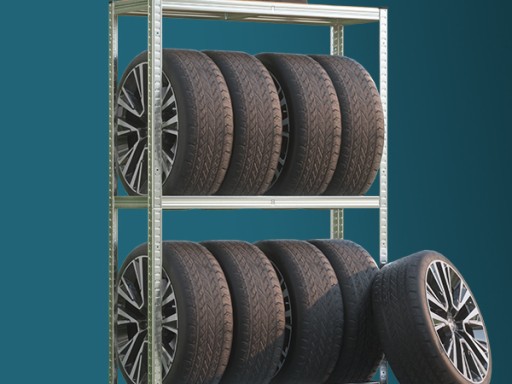 Regał magazynowy ma 3 poziomy i miejsce na maksymalnie 8 opon.