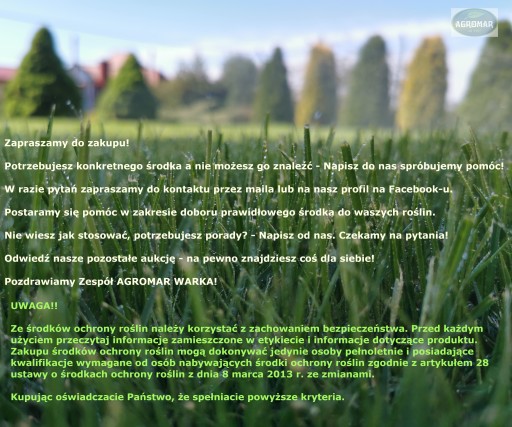Środki ochrony roślin mogą być nabywane wyłącznie przez osoby pełnoletnie oraz posiadające kwalifikacje wymagane od osób nabywających środki ochrony roślin określone w art. 28. Ustawy o środkach ochrony roślin z dnia 08.03.2013r.(Dz.U.z 2017r. poz.50 z późn.zm.). Ze środków ochrony roślin należy korzystać z zachowaniem bezpieczeństwa. Przed każdym użyciem przeczytaj informacje zamieszczone w etykiecie i informacje dotyczące produktu.