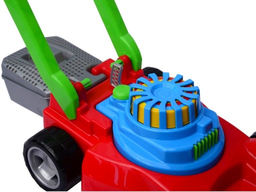 Красочная детская газонокосилка с корзиной.