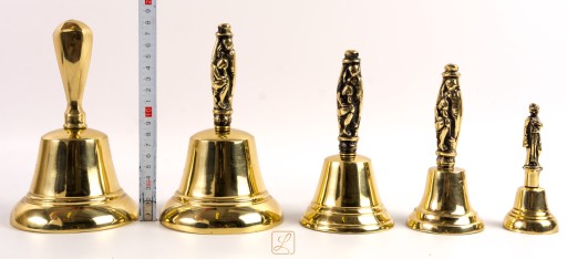 Nowy, odlany z mosiądzu, toczony duży dzwonek ręczny z czterema postaciami zdobiącymi uchwyt, po dwie z każdej strony. Produkt polski — wspieramy polskie rzemiosło.